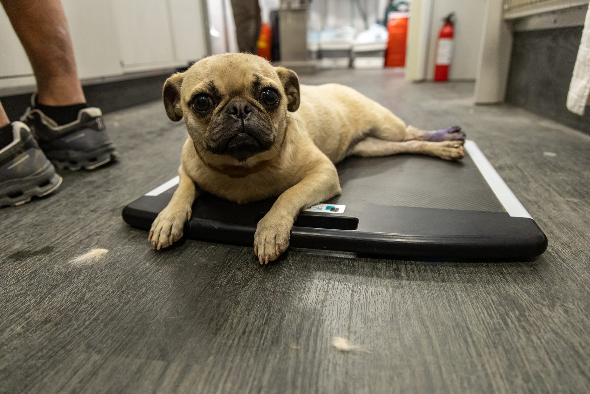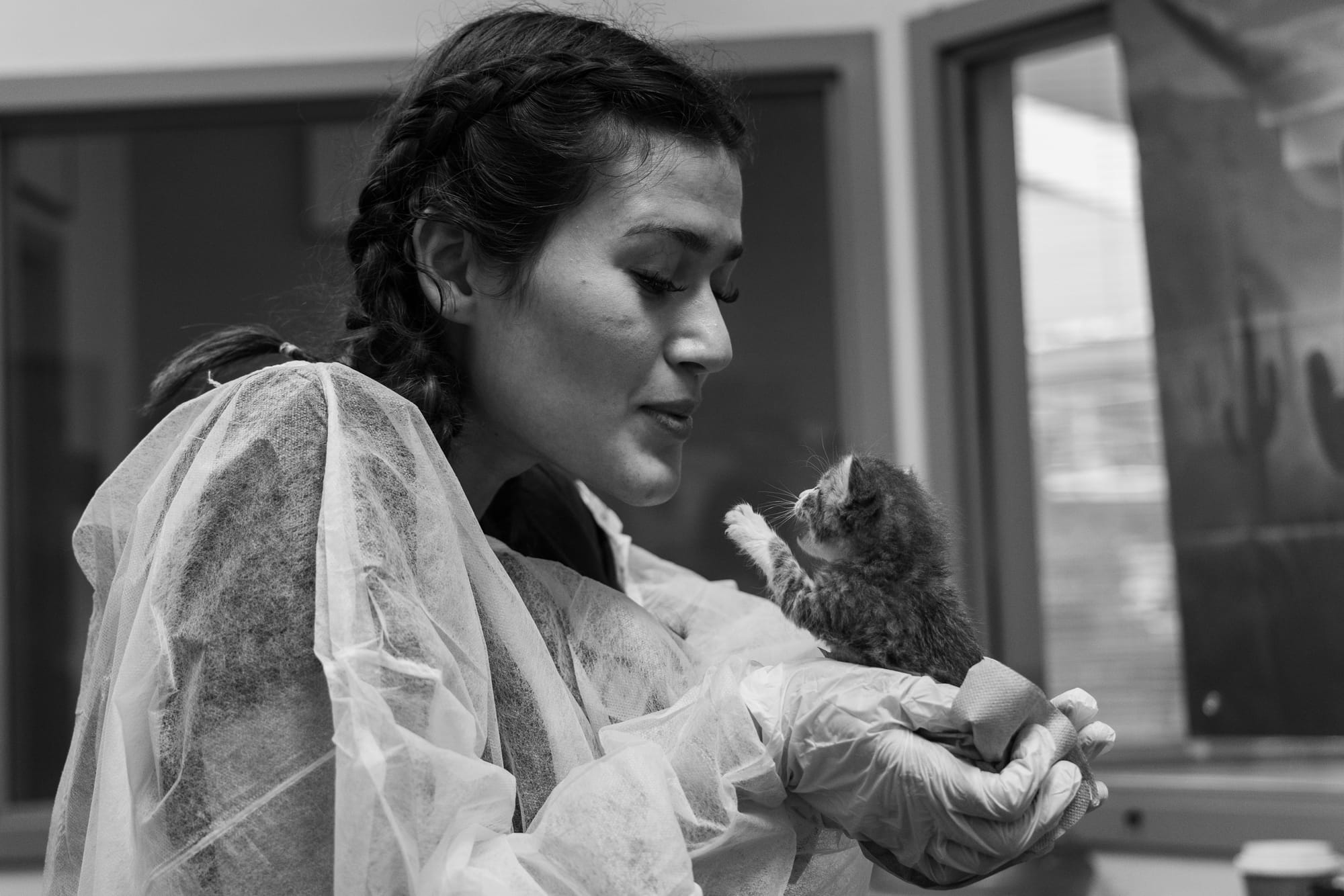 Scenes from "Gimme Shelter". Clockwise from top left: shelter cat Mikey spends time in an incubator while recovering from respiratory issues, blood is drawn on a shelter dog in triage, shelter staff handle cases in the clinic, a pug with a broken pelvis and injured hind leg lays on a scale inside a mobile vet clinic van, a stray dog eats kibble on the side of a road in the Rio Grande Valley (TX), a few weeks' old kitten extends a paw to a vet tech at an outreach clinic, a chihuahua mix recovers in a cage in the shelter ICU on a rabies hold, a shelter vet holds an amputated section of lower jaw during a mandibulectomy.