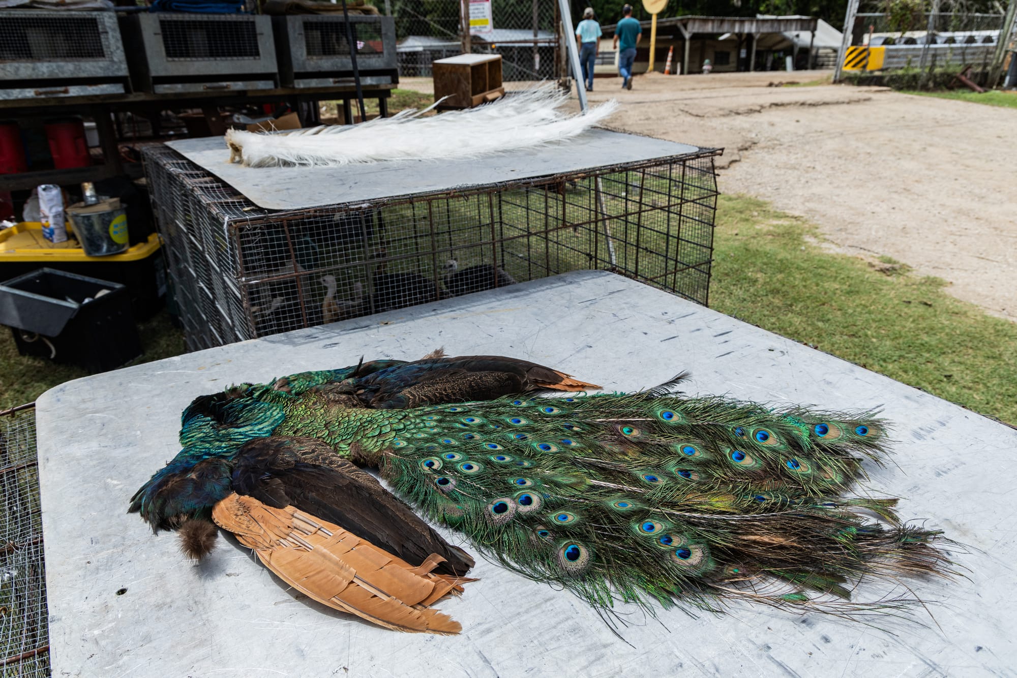 Left: A human baby in a Pack'N Play watches as a young piglet walks around a stall. Right: the remains of a peacock are displayed for purchase. Canton, TX. August 29, 2025.