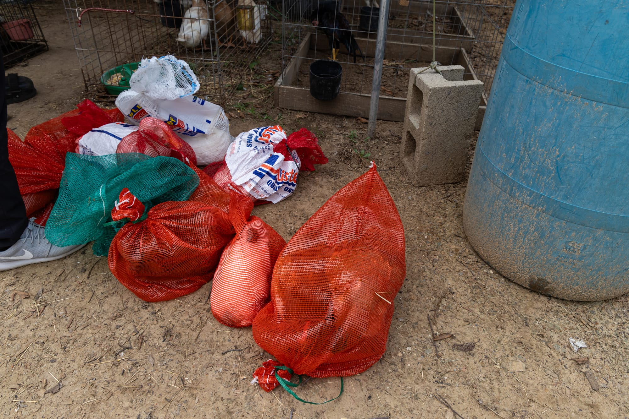 Over Labor Day, I visited my new pal (and moto queen) Paula in Texas for her birthday and more dirt bike riding. Knowing a little of my work background, she suggested we stop by Dog Alley in Canton before heading to the main flea market—“bring your camera”—so we did. Dog Alley has existed for many decades and is known most widely for the various dog breeders who sell puppies there, sometimes alongside farm animals and sometimes by themselves. It's not uncommon to see "cava-chi" puppies in a cage above guinea fowl or a chihuahua mix kept in a box next to fighting roosters or a French bulldog puppy with noticeable physical issues being held up for display. But the beyond the dogs, the market was chock full of open air stalls, many filled with rows of cages: birds, pigs, geese, ducks, even peacocks. These animals are sold live, then roughly handled into "to go" sacks and carried away. Documentation wasn’t hard; most sellers didn’t mind when I asked if I could photograph. I firmly believe in staying curious, so I ask questions, not out of investigative urgency but genuine interest, and maybe that makes people less defensive. It's hard to say.